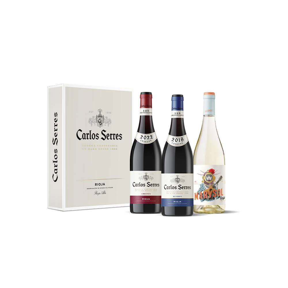 Estuche exclusivo para celebrar San Valentín, con 1 botella Carlos Serres Crianza 2022 + 1 botella Carlos Serres Reserva 2018 + 1 botella Marysol (semidulce).