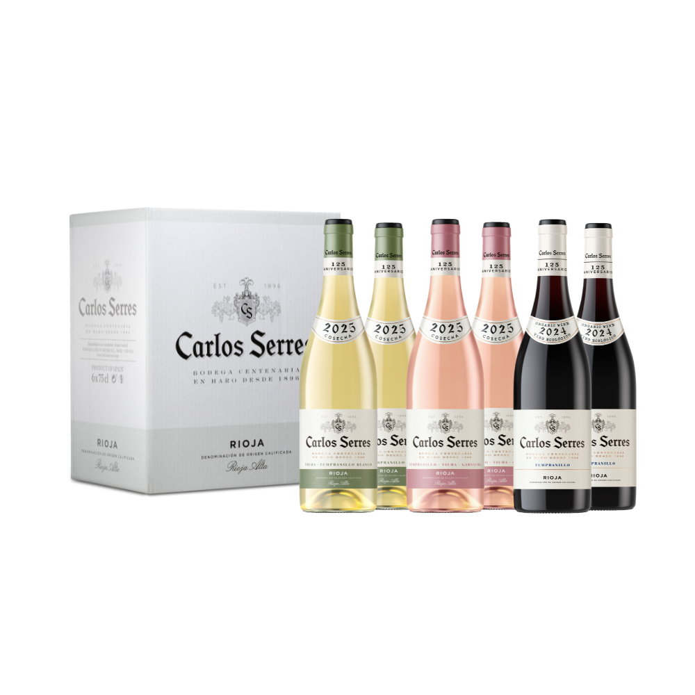 Pack exclusivo con 6 botellas de nuestros vinos Jóvenes: 2 botellas Rosado 2025 + 2 botellas Blanco 2025 + 2 botellas Tempranillo Ecológico 2024.
